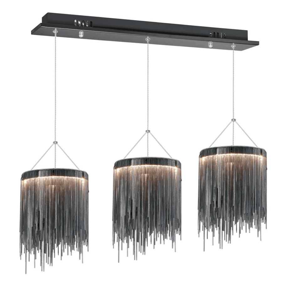 CASCATA BLACK ML3796 to designerska lampa wisząca z trzema źródłami światła. Wykonana jest z metalu w kolorze czarnym. Lampa posiada trzy efektowne klosze przypominające wodospad wykonany z dziesiątek zwisających łańcuszków. Bardzo ciekawy wygląd sprawia, że lampa będzie idealnym wyborem do wnętrz nowoczesnych. Doskonale wpasuje się do: salonu, sypialni, jadalni, gabinetu. Dużym atutem jest możliwość regulacji wysokości. Wysokość maksymalna to: 100 cm, szerokość 75 cm, głębokość 20 cm. Klosz ma wysokość 27 cm i średnicę 20 cm. Lampa posiada wbudowane źródła światła 54W LED 3000K 1350lm. Źródło światła jest wymienne.