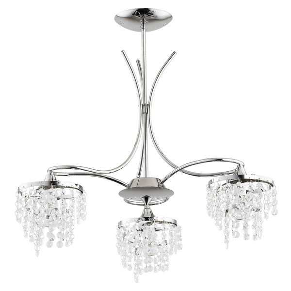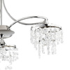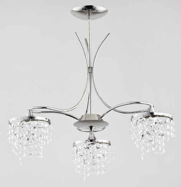 Stelaż lampy wykonany z metalu w kolorze chromu, na którym zwisają transparentne kryształki.