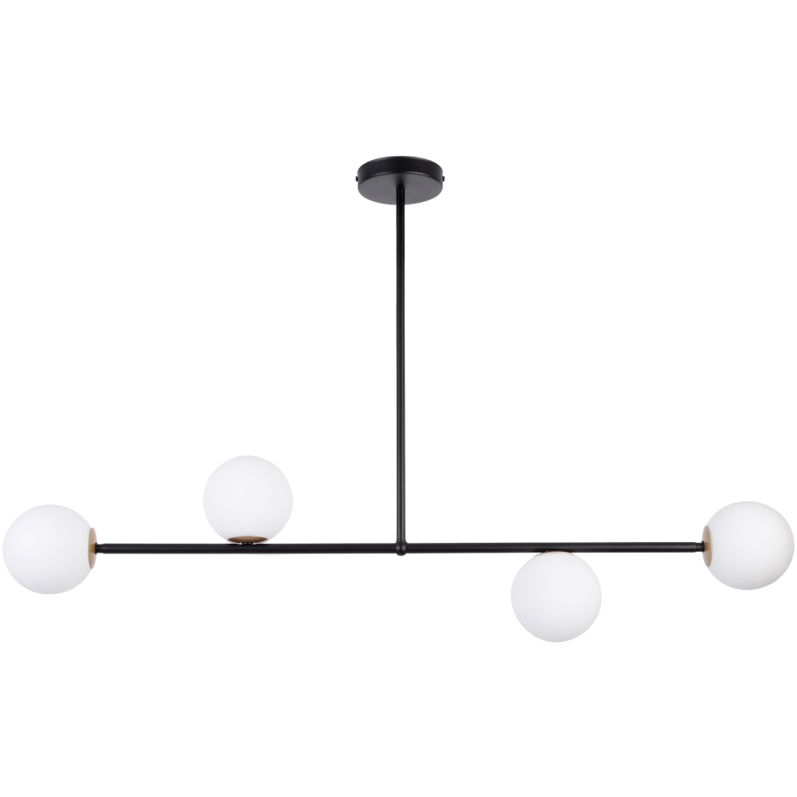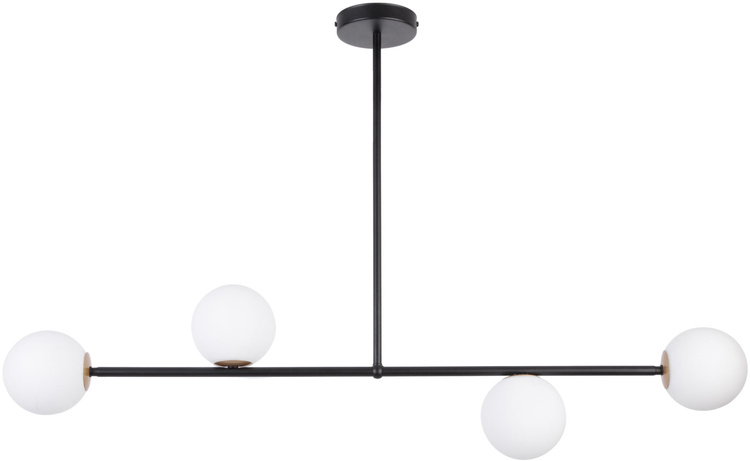 GAMA 4 to nowoczesna lampa sufitowa z 4 źródłami światła. Stelaż lampy wykonany jest ze stali lakierowanej proszkowo w kolorze czarnym. Lampa posiada cztery białe szklane klosze w kształcie kul osadzone na poziomym ramieniu. Lampa jest idealnym wyborem do nowoczesnych wnętrz. Idealnie wkomponuje się do salonu, gabinetu, biura, sypialni, jadalni, pokoju młodzieżowego. Wysokość lampy to 68 cm, szerokość 104 cm, głębokość 12 cm. Klosz ma wysokość 12 cm. Źródłem światła jest żarówka typu G9 o mocy max. 25W w ilości 4 szt.