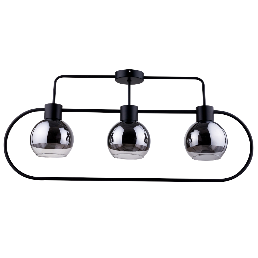 LINDA 3 PL to nowoczesna lampa sufitowa z 3 źródłami światła. Stelaż lampy wykonany jest ze stali lakierowanej proszkowo w kolorze czarnym, posiada trzy szklane srebrne transparentne klosze. Lampa kształtem przypomina poziomą elipsę wewnątrz której znajdują się klosze. Jest idealnym wyborem do wnętrz industrialnych, typu loft, nowoczesnych oraz klasycznych. Idealnie wkomponuje się do salonu, gabinetu, biura, sypialni, jadalni, pokoju młodzieżowego. Wysokość lampy to 37 cm, szerokość 83 cm, głębokość 14 cm. Klosz ma wysokość 13 cm. Źródłem światła jest żarówka typu E27 o mocy max. 60W w ilości 3 szt.