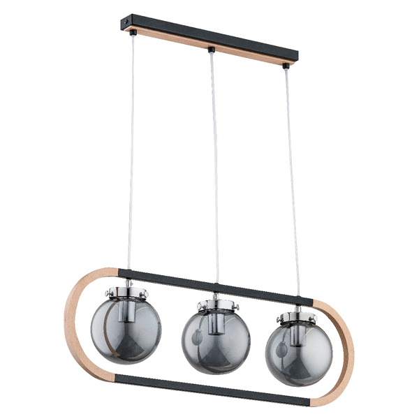 Lampa kształtem przypomina poziomą elipsę, wewnątrz której znajdują się trzy szklane chromowane klosze, wiszące na przewodach w kolorze białym. Nietuzinkowe połączenie kształtów geometrycznych sprawia że lampa jest idealnym wyborem dla wnętrz nowoczesnych, klasycznych, industrialnych oraz typu loft.