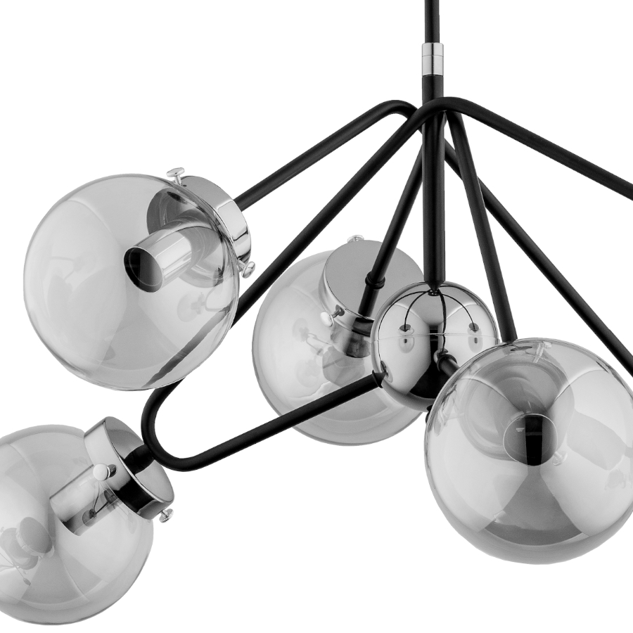 Niestandardowa konstrukcja i ciekawy design lampy w połączeniu z ozdobnymi kloszami,