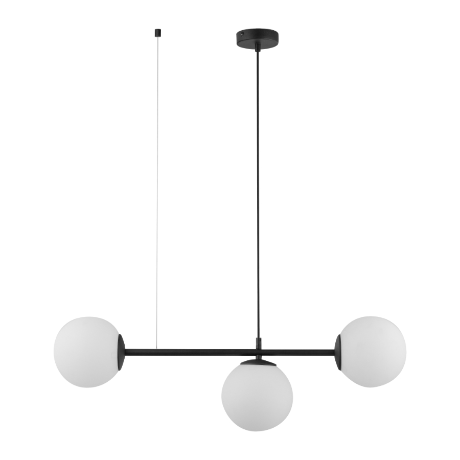 Lampy CELESTE zwraca na siebie uwagę dzięki białym, okrągłym kloszom na czarnej, wyrazistej konstrukcji.