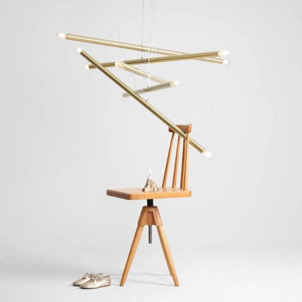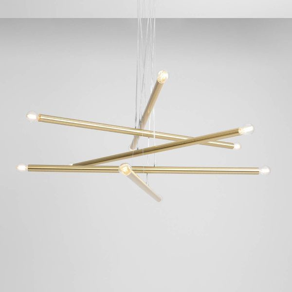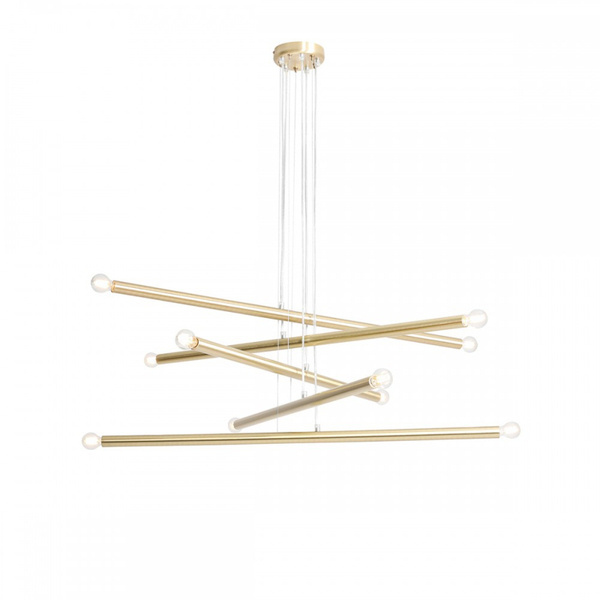 TUBO 10 to nowoczesna lampa wisząca z dziesięcioma źródłami światła, która składa się z pięciu luźno zawieszonych metalowych tub w kolorze mosiądzu zakończonych oprawkami żarówek. Lampa nie posiada kloszy co sprawia, że odsłonięte żarówki mogą być elementami ozdobnymi dlatego warto wybrać ich dekoracyjny model. Oprawa będzie idealnym wyborem do wnętrz urządzonych w stylu nowoczesnym, minimalistycznym oraz loftowym. Doskonale będzie się prezentować w: salonie, jadalni, sypialni, pokoju młodzieżowym, gabinecie, lokalu, kuchni. Dużą zaletą jest możliwość regulacji wysokości oraz pochylenia tub. Wysokość maksymalna lampy to: 105 cm, szerokość 100 cm, głębokość 100 cm. Źródłem światła jest żarówka typu E14 o mocy max 40W w ilości 10 szt.