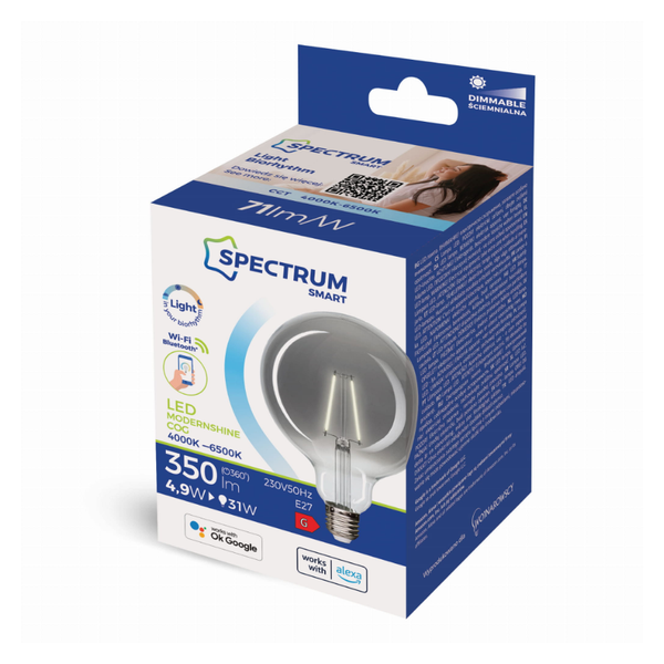 Inteligentna żarówka smart, źródło LED GLOB 4,9W E-27 CCT COG MODERNSHINE SPECTRUM SMART z możliwością zmiany temperatury barwowej światła (CCT), ściemniania (DIMM) oraz zdalnego uruchamiania i sterowania za pomocą aplikacji Spectrum SMART na Twoim urządzeniu mobilnym.