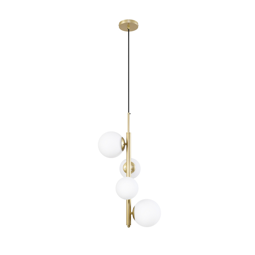 CORDEL 34-01559 to stylowa lampa wisząca z czterema źródłami światła. Zawiesie lampy wykonano z wysokiej jakości stali w kolorze mosiężnym, klosze są z białego szkła. Oprawa będzie idealnym wyborem do wnętrz urządzonych w stylu klasycznym oraz nowoczesnym. Doskonale będzie się prezentować w salonie, jadalni, sypialni, pokoju, młodzieżowym, gabinecie, lokalu, kuchni. Dużym atutem jest możliwość regulacji wysokości. Wysokość maksymalna lampy to: 120 cm, szerokość 32 cm, głębokość 28 cm. Źródłem światła jest żarówka typu G9 o mocy max 20W w ilości 4 szt.