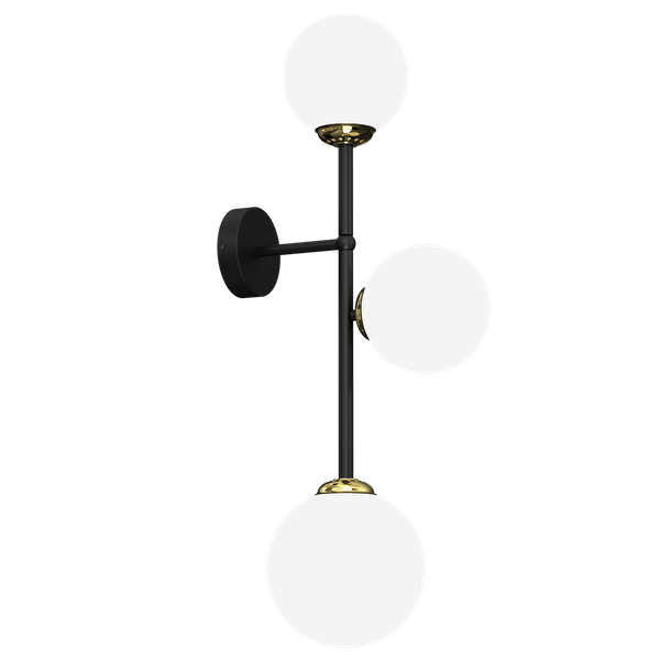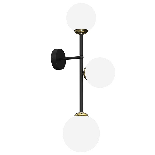 POP MLP7844 to stylowa lampa ścienna z trzema źródłami światła. Korpus lampy wykonano z wysokiej jakości metalu w kolorze czarnym ze złotymi detalami. Klosze są z białego szkła. Oprawa będzie idealnym wyborem do wnętrz urządzonych w stylu klasycznym oraz nowoczesnym. Doskonale będzie się prezentować w: salonie, jadalni, sypialni, pokoju młodzieżowym, gabinecie, biurze, lokalu, przedpokoju, korytarzu. Wysokość lampy to: 64 cm, szerokość 17 cm, głębokość 30 cm. Źródłem światła jest żarówka typu E14 o mocy max 40W w ilości 3 szt.