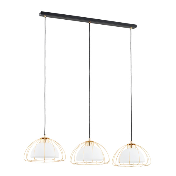 Klosze osłonięte są złotą metalową "klatką", co nadaje lampie niebanalny, designerski charakter.