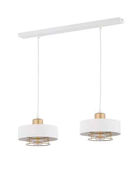 POKER 2 to nowoczesna lampa wisząca z 2 źródłami światła. Stelaż lampy wykonano ze stali lakierowanej na kolor biały. Lampa posiada także dwa stalowe klosze w kolorze białym. Oprawa żarówki ma kolor złoty. Wokół żarówek wewnątrz kloszy umieszczono ozdobne metalowe kratki koloru złotego. Dodatkowym elementem ozdobnym w tej lampie jest żarówka. Dowolność wyboru kształtu i barwy żarówki sprawia, że możemy dostosować wygląd lampy do charakteru wnętrza. Połączenie koloru białego ze złotym sprawia, że wnętrze nabiera niezwykłego wyglądu. Lampa będzie idealnym wyborem do wnętrz nowoczesnych, industrialnych oraz typu loft. Idealnie wkomponuje się do biura, gabinetu, jadalni, kuchni, salonu, sypialni. Dużym atutem jest możliwość regulacji wysokości. Wysokość maksymalna lampy to 70 cm, szerokość 60 cm, głębokość 20 cm. Klosz ma wysokość 8,5 cm i średnicę 20 cm. Źródłem światła jest żarówka typu E27 o mocy max. 60W w ilości 2 szt.